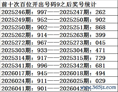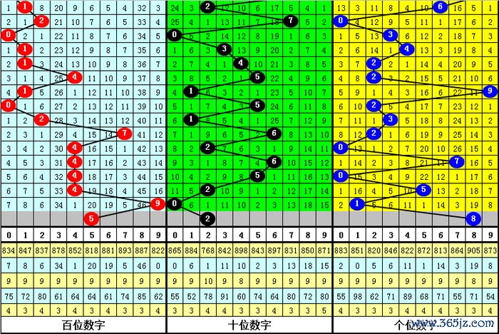 二、百位分析:上期开出号码9,前10次号码9出现之后下期分别开出号码:2983047640,其中号码大小比为4:6,基本持平;奇偶比为3:7,奇数号码走势较冷;012路比为5:3:2,2路号码走势非常冷。本期参考号码:5。