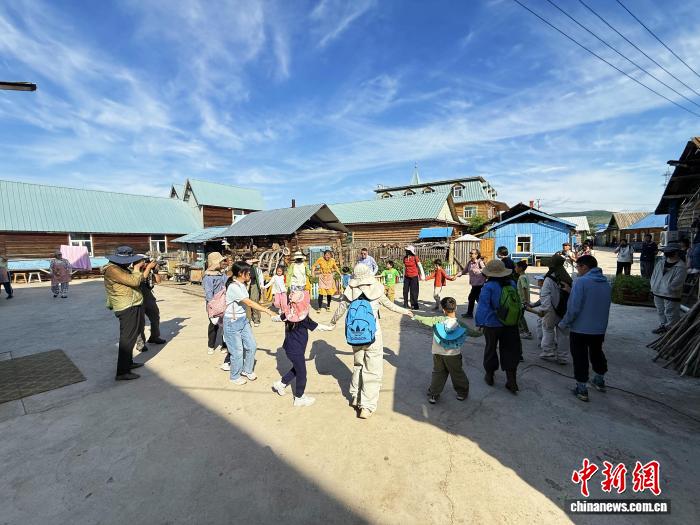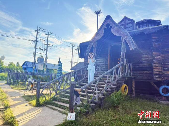 7月12日,内蒙古额尔古纳,游客打卡木刻楞传统建筑。 中新社记者 张玮 摄