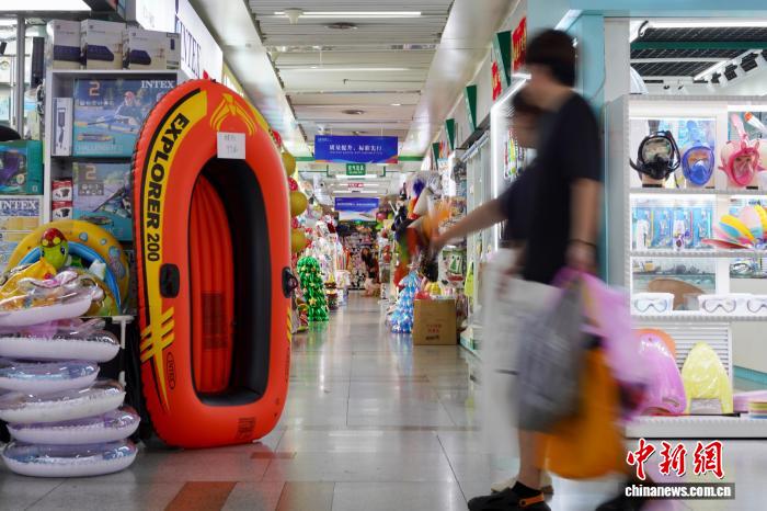 7月4日,在浙江义乌国际商贸城,两位采购商从售卖皮划艇的档口前走过。董易鑫 摄