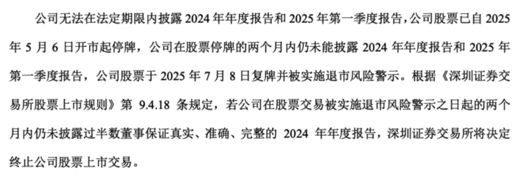 根据交易所规定,一旦被实施了退市风险警示,两个月内还不能披露符合要求的年报,深交所将终止该公司上市。这意味着,如果公司在未来不到一个月的时间内无法披露2024年年报,公司将被强制退市。