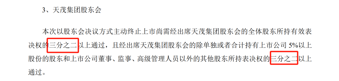 公告显示,*ST天茂主动退市议案需经股东会两个“三分之二”通过:全体股东表决权的三分之二以上,以及中小股东(持股5%以下)表决权的三分之二以上。