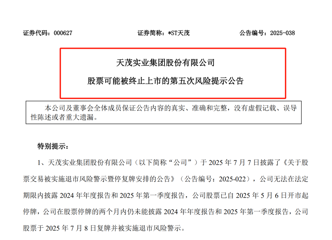由于迟迟未披露2024年年报和2025年第一季度报告,天茂集团股票在5月6日开市起被深交所依规实施停牌。7月8日开市起,公司股票被实施退市风险警示,股票简称由“天茂集团”变更为“*ST天茂”。